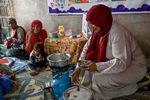 গ্রামীণ মায়েদের জন্য বিশেষ রান্না শেখানো হচ্ছে সুজাওয়াল, পাকিস্তান—ক্ষুধার্ত শিশুকে কোলে নিয়ে একদল মা সেমাই দিয়ে খাবার রান্না করছেন প্রশিক্ষকের
