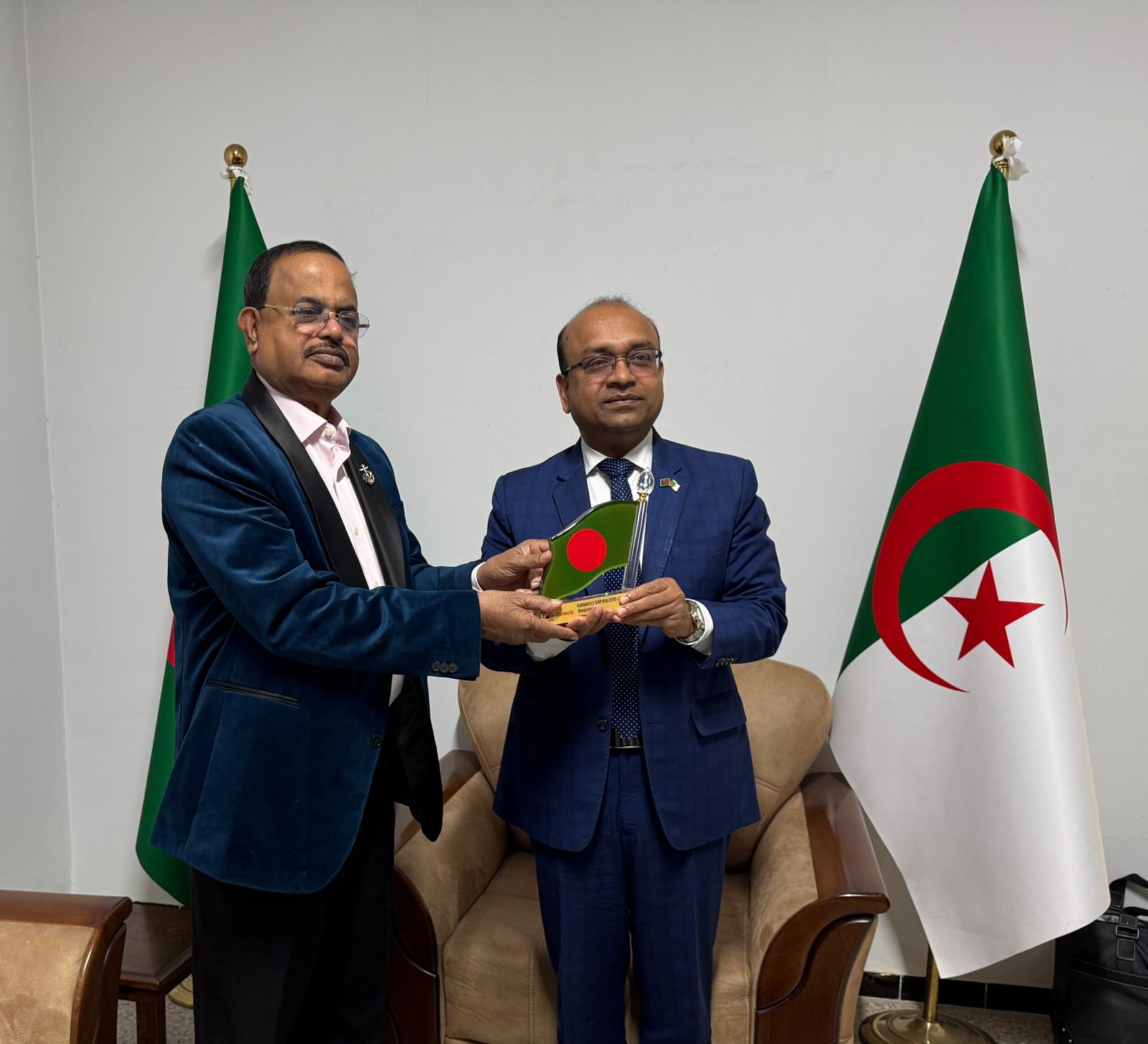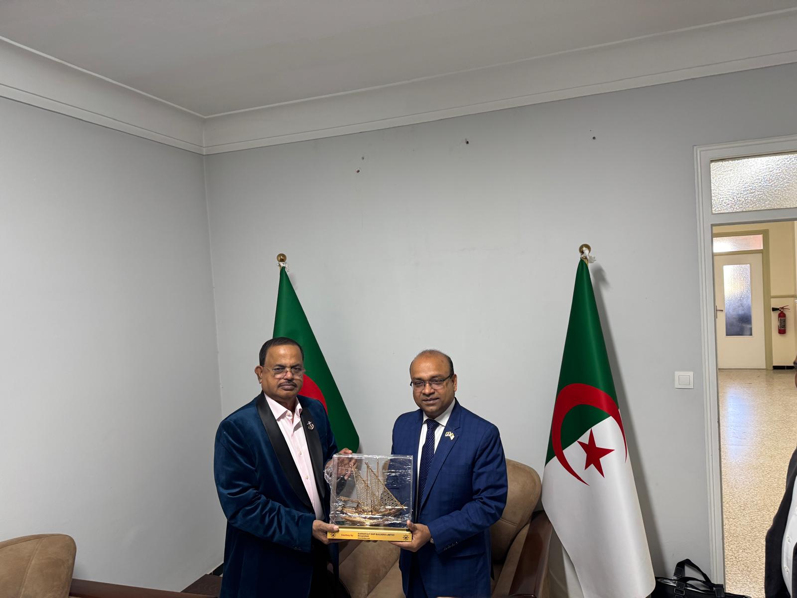 বাংলাদেশের নৌ ও জাহাজ নির্মাণ খাতের একটি ব্যবসায়ী প্রতিনিধি দল আলজেরিয়ার রাজধানী আলজিয়ার্সে অবস্থিত বাংলাদেশ দূতাবাস পরিদর্শন করেছে। দেশটির সঙ্গে জাহাজ নির্মাণ খাতে সহযোগিতা বাড়ানোর সম্ভাবনা যাচাই করতেই এই সফর আয়োজন করা হয়।