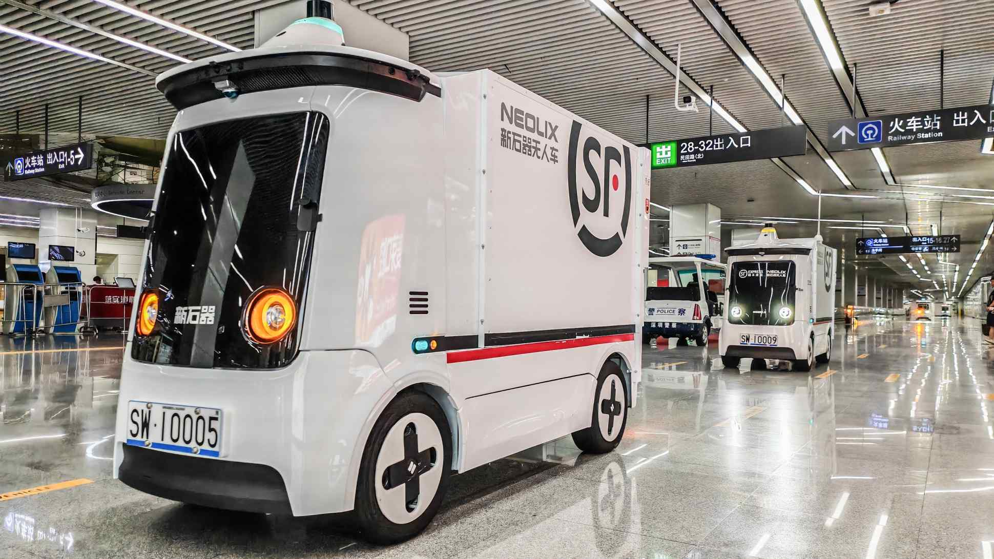 শেনঝেনে রাত আটটা নাগাদ যখন রাশ আওয়ারের চাপ কিছুটা কমে আসে, সেখানকার SF Express-এর স্টোরেজ সুবিধা থেকে একাধিক স্বয়ংক্রিয় রোবোভ্যান চালু হয়। এসব যানবাহন একটি নির্ধারিত রুট ধরে চলতে থাকে—পার্সেল নিয়ে স্টোরেজ এলাকা থেকে রেলওয়ে স্টেশনের প্ল্যাটফর্মের কাছে সংযোগ স্থলে এসে থামে। মানুষ যেন দুই মিটার দূরত্ব বজায় রাখে, সেই বিষয়টি তাদের গোলমাল শব্দে সতর্ক করা হয়—আর যদি যাত্রী পায়ে এগিয়ে আসে, তাহলে ভ্যান থেমে যায়।