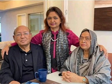 আনন্দঘন মুহূর্তে স্ত্রী আনোয়ারা আহমেদ ও একমাত্র কন্যা তাসলিমা আহমেদ জামানের সঙ্গে জাতীয় নেতা তোফায়েল আহমেদ।