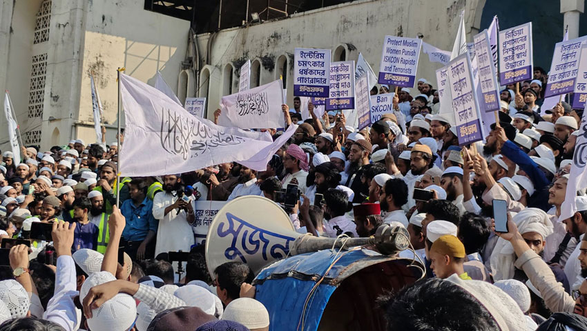 ইন্তিফাদা বাংলাদেশের সদস্য আহমেদ রফিক বলেন, “মুসলিম নারীকে ধর্ষণের পর সেটি গর্বের সঙ্গে প্রকাশ করা হচ্ছে—এটি আমাদের সমাজের চরম অবক্ষয়।” তিনি অভিযোগ করেন, “ইসকনের বিরুদ্ধে কথা বলার কারণে এক খতিবকে অপহরণ করে শিকলে বেঁধে হত্যা করা হয়েছে। এমন ঘটনা বারবার ঘটছে, অথচ রাষ্ট্র চুপ করে আছে, প্রশাসন অপরাধীদের বাঁচাতে ব্যস্ত।”