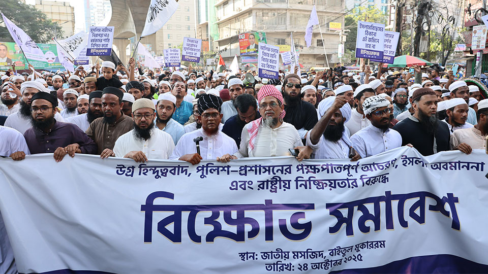 তিনি আরও বলেন, “আমাদের সম্প্রীতির কথা বলা হয়, আমাদেরকে মন্দির পাহারা দিতে বলা হয়, কিন্তু মুসলিম নারীর সম্মান যখন লুণ্ঠিত হয় তখন তাদের মুখে কবরের নীরবতা।”