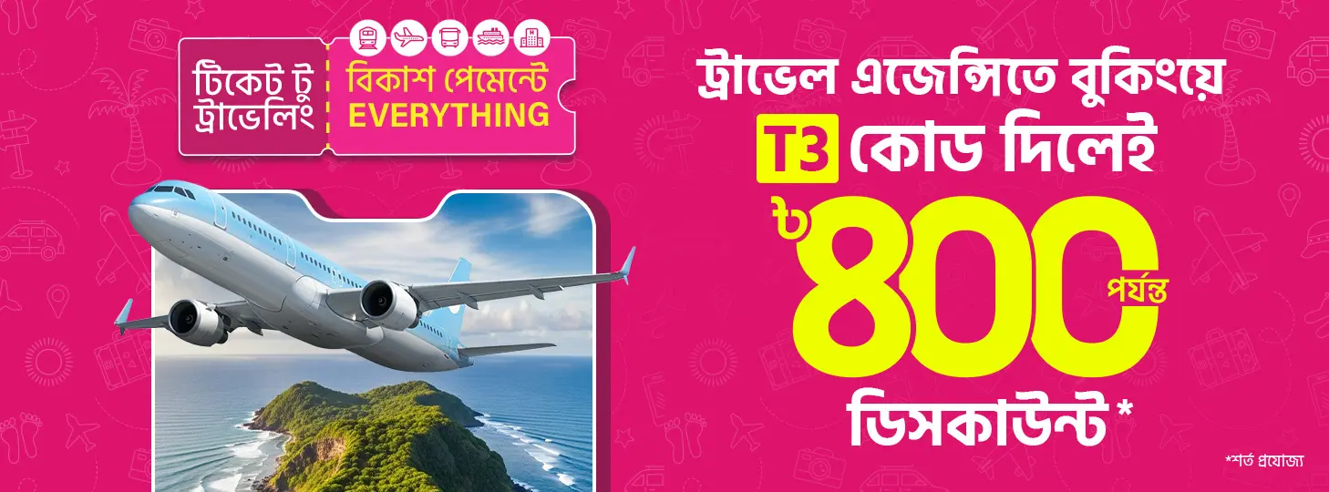 এসএস ইন্টারন্যাশনাল ট্রাভেলস, ফর্চুন ট্রাভেলস, ভ্রমণটো, নেভিগেটর ট্যুরিজম এবং গো প্লেন–এর মতো ট্রাভেল এজেন্সিতে বুকিং করলে ‘T3’ কোড ব্যবহার করে ন্যূনতম ৫,০০০ টাকার বিকাশ পেমেন্টে পাওয়া যাবে ২০০ টাকার ছাড়। এই অফারও দিনে একবার এবং সর্বোচ্চ দুইবার ব্যবহারযোগ্য, মোট ছাড় ৪০০ টাকা।