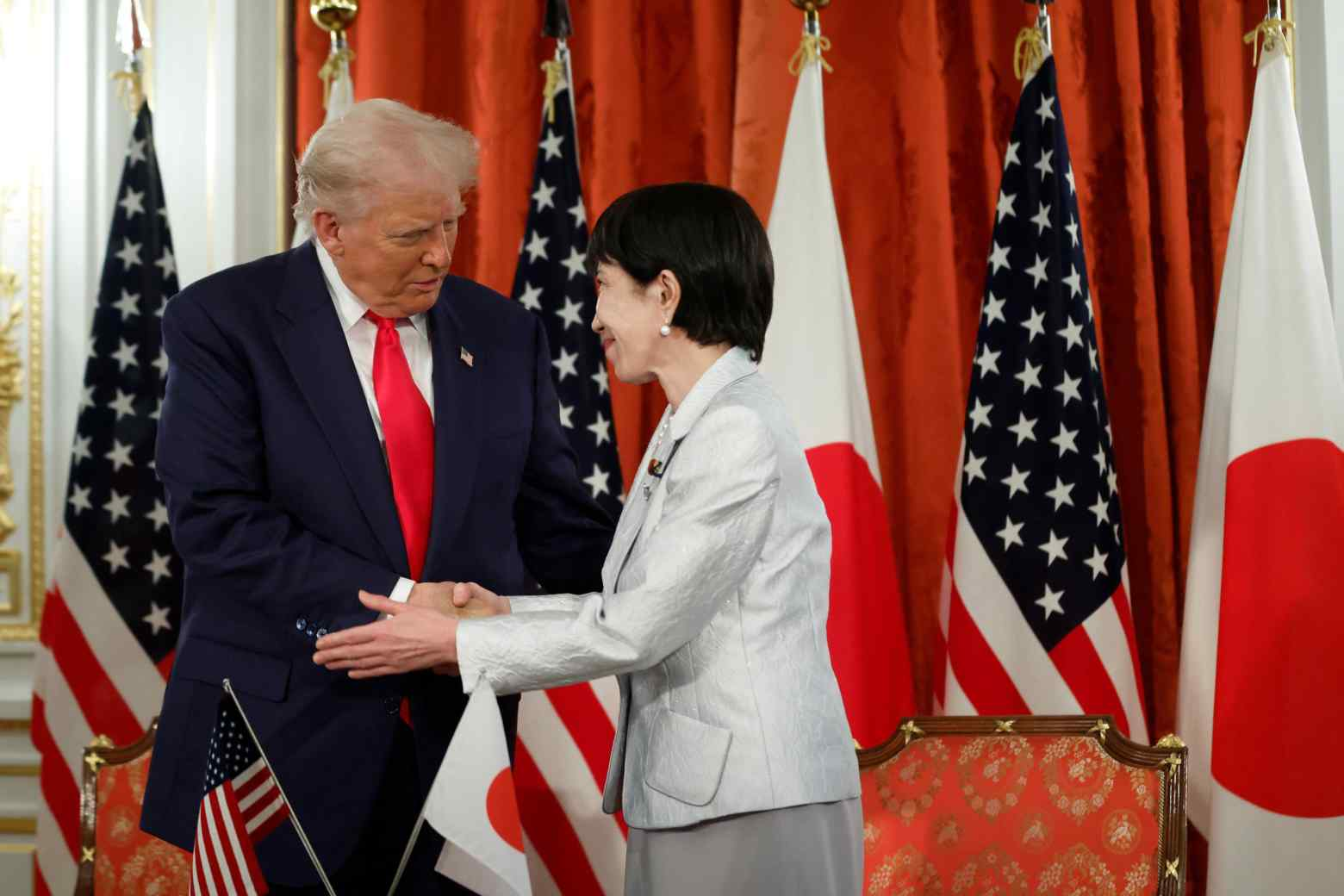 ট্রাম্পের প্রতি আস্থা অর্জনে তাকাইচি তাঁর বৈশ্বিক শান্তি উদ্যোগের প্রশংসা করেন। তিনি বলেন, ট্রাম্প থাইল্যান্ড ও কম্বোডিয়ার মধ্যে শান্তিচুক্তি এবং মধ্যপ্রাচ্যে ইসরায়েল–হামাস যুদ্ধবিরতি সফলভাবে সম্পন্ন করে এক “অভূতপূর্ব ঐতিহাসিক সাফল্য” অর্জন করেছেন।