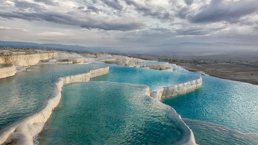দূর থেকে পামুক্কালেকে দেখলে মনে হয় যেন একটি স্কি রিসোর্ট—সাদা পাহাড়ের ঢাল বেয়ে নেমে আসছে ঢেউয়ের মতো স্তর, আর তার ওপর হাঁটছে পর্যটকের দল। কিন্তু আশ্চর্যের বিষয় হলো, এগুলো বরফ নয়, বরং গরম পানির খনিজে জমে ওঠা সাদা পাথরের স্তর, যা গ্রীষ্মের তপ্ত সূর্যের মধ্যেও গলে যায় না।