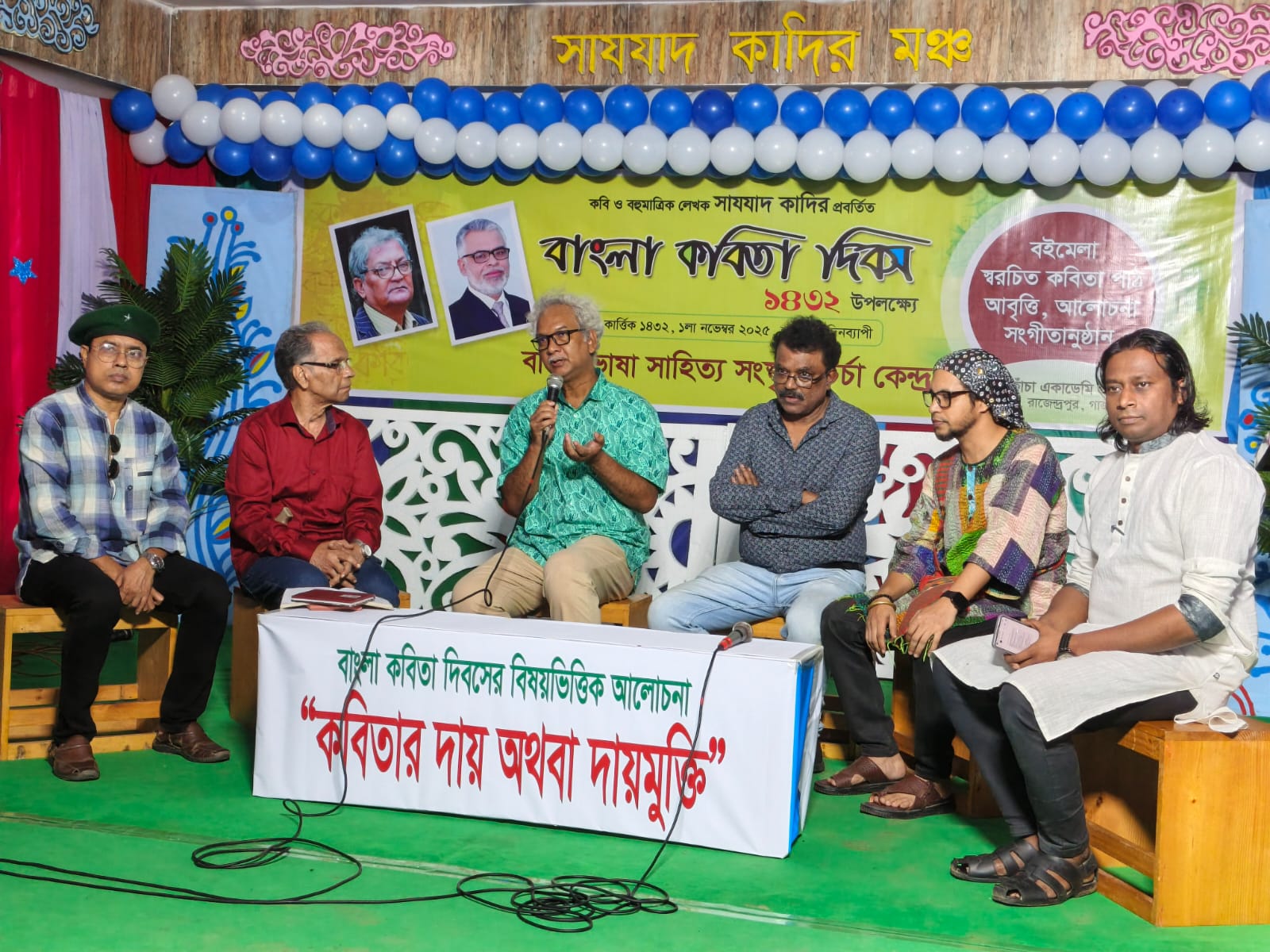 অধ্যাপক অসীম বিভাকরের সঞ্চালনায় অনুষ্ঠিত হয় ‘কবিতার দায় অথবা দায়মুক্তি’ শীর্ষক আলোচনা সভা। এতে বক্তব্য রাখেন সংস্কৃতিজন লিয়াকত চৌধুরী, লেখক ও রসায়নবিদ সাঈদ চৌধুরী, কবি আহাম্মাদুল কবির ও কবি পথিক রানা।