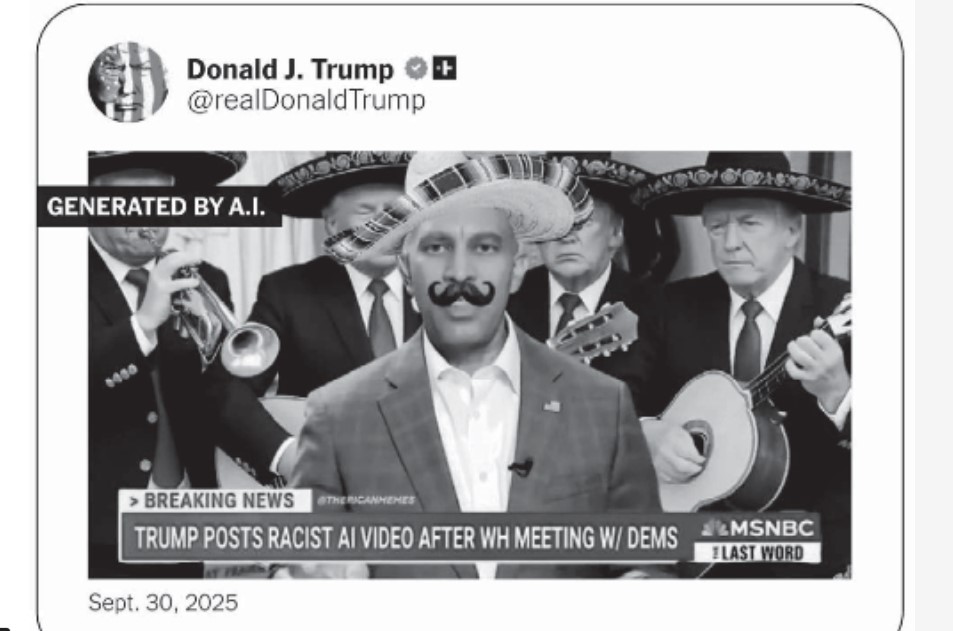 একটি বিতর্কিত ভিডিওতে ট্রাম্পকে দেখা যায় ডেমোক্র্যাট নেতা হাকিম জেফ্রিজকে মেক্সিকান পোশাকে চিত্রিত করতে যেখানে চাক শুমার কণ্ঠস্বরকেও এআই-এর মাধ্যমে বিকৃত করা হয়েছে। সমালোচনার মুখে ট্রাম্প এরপর একই ভিডিওর রসিক সংস্করণ প্রকাশ করেন, যেখানে চারটি এআই ভিডিওতে ট্রাম্পকে দেখা যায় মারিয়াচি ব্যান্ডের সদস্য হিসেবে।