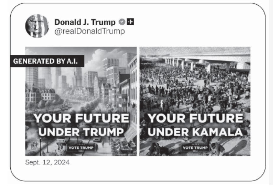 ট্রাম্প তাঁর প্রচারণায় “ওপেন বর্ডার” নীতির পরিণতি বোঝাতে দুটি এআই চিত্র তুলনা করেন—একটিতে শান্তিপূর্ণ আমেরিকা, অন্যটিতে আবর্জনায় ভরা বিশৃঙ্খল দৃশ্য।
