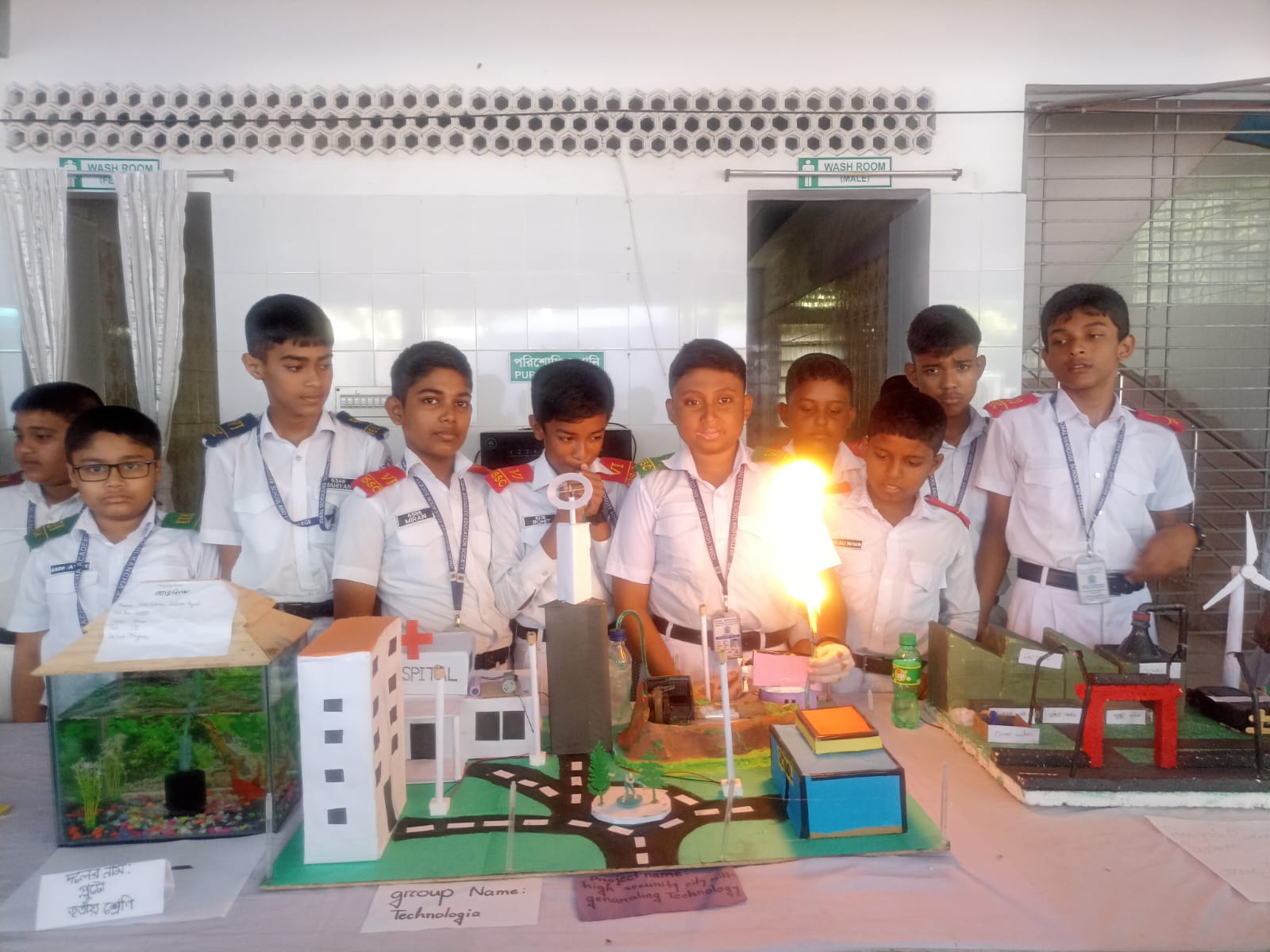 প্রথম স্থান অর্জন করে ষষ্ঠ শ্রেণির শিক্ষার্থী মুনতাসির ইসলামের নেতৃত্বে ‘Technology’ দলের ‘High Security System with Generating Technology’।