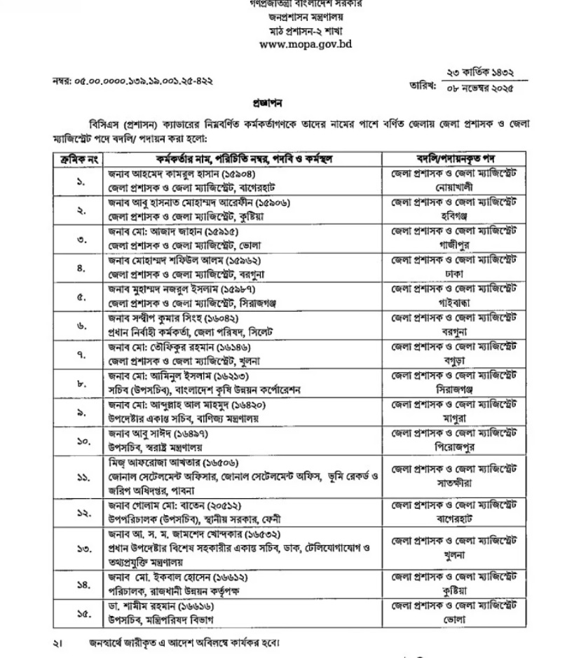 জনপ্রশাসন মন্ত্রণালয় শনিবার (৮ নভেম্বর ২০২৫) রাতে এক প্রজ্ঞাপনের মাধ্যমে এ তথ্য জানায়। নির্বাচন ঘনিয়ে আসায় মাঠ প্রশাসনে স্থিতিশীলতা ও কার্যকর তদারকির লক্ষ্যে এই পদক্ষেপ নেওয়া হয়েছে বলে জানা গেছে।