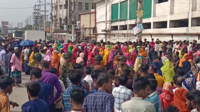 ঢাকার সাভারের আশুলিয়ায় বকেয়া বেতন পরিশোধ ও বন্ধ কারখানা পুনরায় চালুর দাবিতে বিক্ষোভে নামে ঢাকা রফতানি প্রক্রিয়াকরণ অঞ্চলের (ডিইপিজেড) একই মালিকানাধীন চারটি কারখানার শ্রমিকরা।