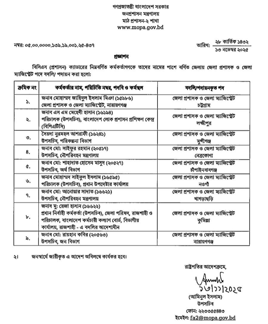 • ৮ নভেম্বর ১৫ জেলায় নতুন ডিসি নিয়োগ