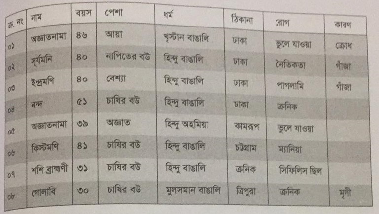 ১৮৫৭ থেকে ১৮৬৬ সাল পর্যন্ত বছরে গড়ে ৯৫ জন পাগলকে ভর্তি করা হয়েছিল ঢাকার পাগলা গারদে। রোগীরা এসেছিল ঢাকা, ময়মনসিংহ, সিলেট, কাছাড়, ত্রিপুরা, চট্টগ্রাম, নোয়াখালী, বাকেরগঞ্জ, ফরিদপুর, পাবনা, বগুড়া, কুচবিহার ও মাসাম থেকে। এই লুনাটিক অ্যাসাইলাম কখন বন্ধ হয়েছিল জানি না। তবে, অনুমান করছি বিশ শতকের শুরুর দিকে পরিকল্পনা করা হয়েছিল কেন্দ্রীয় পাগলা গারদ নির্মিত হবে। সেটি নির্মিত হলে মনে হয় সব রোগীদের সেখানে সরিয়ে এটি বন্ধ করে দেওয়া হয়।