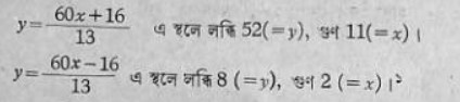 60 এবং 13 ইত্যাদির পরস্পর ভজনে ভাগফল 4, 1,1, 1, 1, ইহাতে পূর্ববদ্ লব্ধিও গুণ যথাক্রমে ৪ এবং 2; ভাগফল বিষমহেতু ইহাদিগকে নিজ নিজ হর 60, 13 হইতে বিয়োগ করিলে লব্ধি ও গুণ 52, 11; যদি প্রশ্নে 16 বিয়োগ থাকে তবে এই ধনক্ষেপে আগত লব্ধি ও গুণকে তাহাদের নিজ নিজ হর 60, 13 হইতে বিয়োগ করিলে লব্ধি ও গুণ 2, ৪।