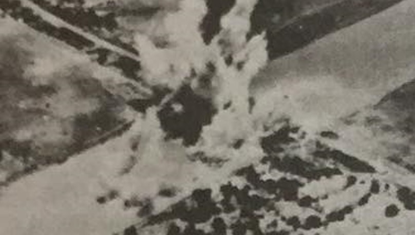 ৪৯০তম বোম্বার্জমেন্টের বোমারু বিমানের বোমা খেয়ে বার্মায় একটি সেতু গুড়িয়ে ধ্বসে যাচ্ছে।