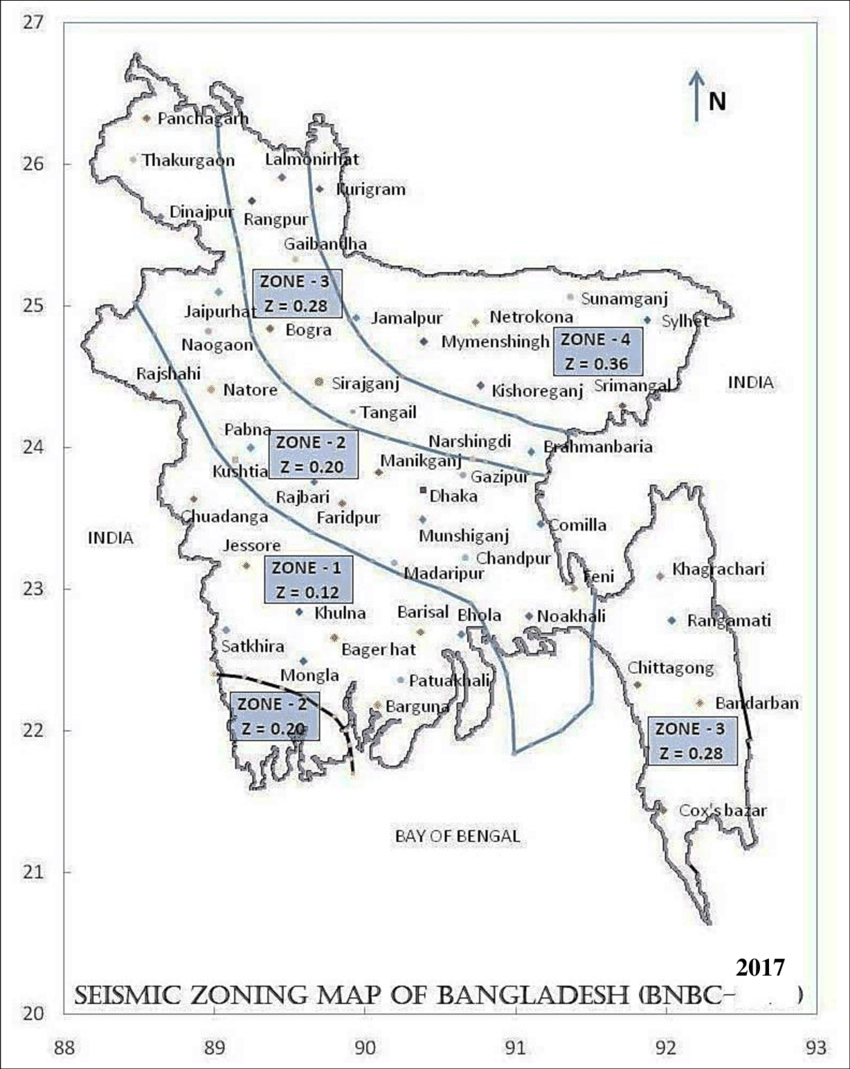 নতুন সিসমিক জোনিং মানচিত্রে দেখা গেছে, বাংলাদেশে বাঁশখালী, ফরিদপুর, কুষ্টিয়া, নাটোর, নীলফামারী, পঞ্চগড়, রাজশাহী, সন্দ্বীপ, বগুড়া, কক্সবাজার, খাগড়াছড়ি, নোয়াখালী, রাঙামাটি এবং রংপুরের বড় অংশকে উচ্চ ভূমিকম্প ঝুঁকিপূর্ণ অঞ্চল হিসেবে চিহ্নিত করা হয়েছে। আগের মানচিত্রে কম ঝুঁকিপূর্ণ দেখানো অনেক এলাকাই বাস্তবে উল্লেখযোগ্য ঝুঁকিতে রয়েছে বলে গবেষণায় উঠে এসেছে।