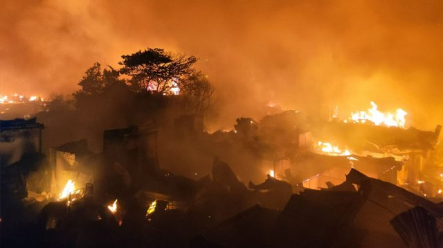 রোজিনা, বস্তির এক বাসিন্দা, দাউদাউ করে জ্বলতে থাকা ঘর থেকে প্রাণে বাঁচলেও রাস্তায় এসে কান্নায় ভেঙে পড়েন।