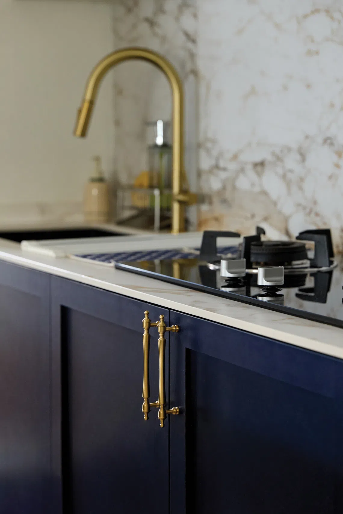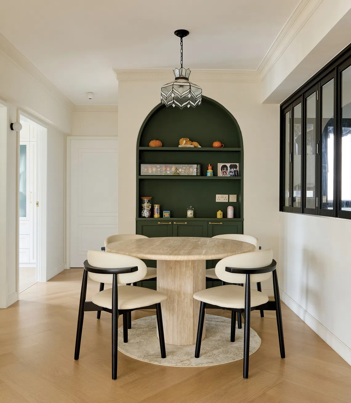 কিচেনের ব্যাকস্প্ল্যাশে বড় সাইজের মার্বেল টাইলস এবং কন্ট্রপসের জন্য সিন্টারড স্টোন ব্যবহার করা হয়েছে। একই সাথে, মেঝে আলো এবং খুঁটিনাটি পরিকল্পনার মাধ্যমে এলাকা সাজানো হয়েছে। ডাইনিং এরিয়াতে একটি কাস্টম-তৈরি মার্বেল টেবিল রয়েছে, যা নিউক্লাসিক্যাল স্টাইলে আলোকিত।
