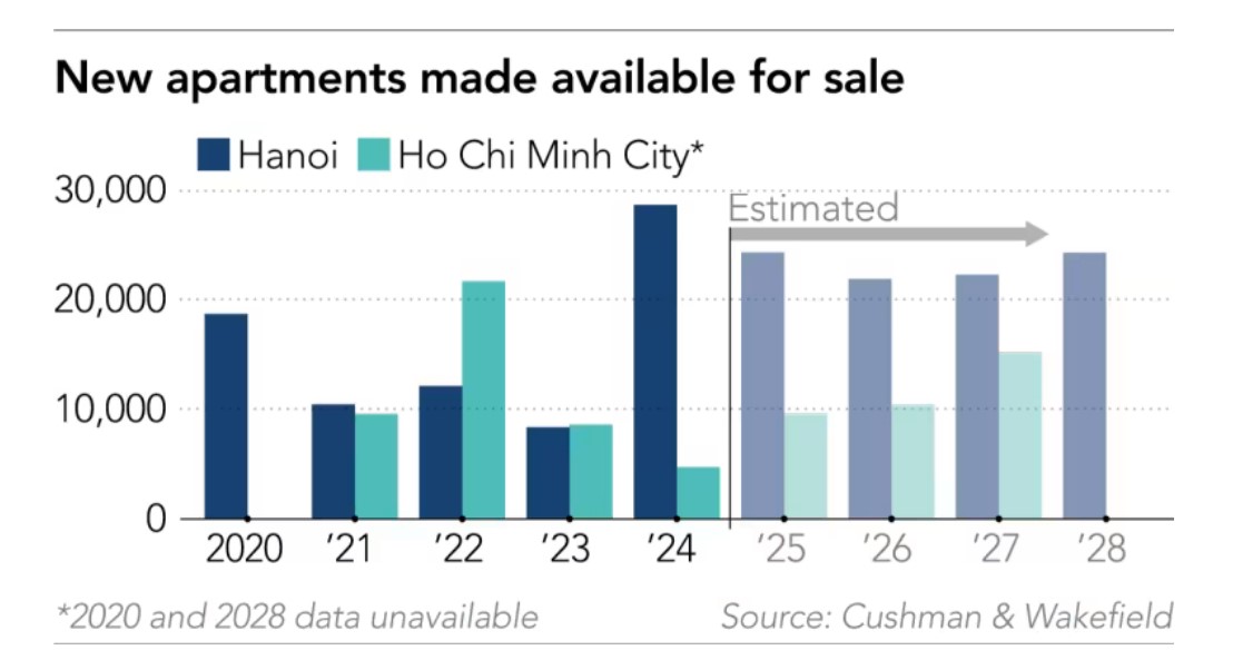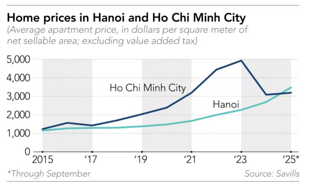 ২০২4–এর জুলাই–সেপ্টেম্বরে হ্যানয়ে প্রতি বর্গমিটারের দাম আগের বছরের তুলনায় ৬০% এবং এইচসিএমসিতে ৬৫% বেড়েছে।