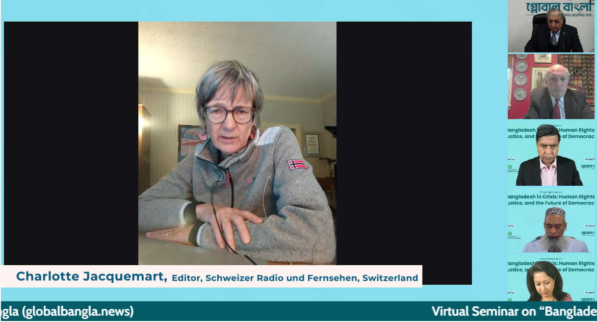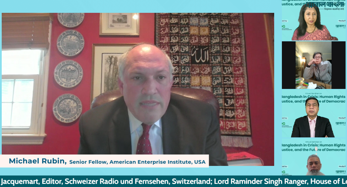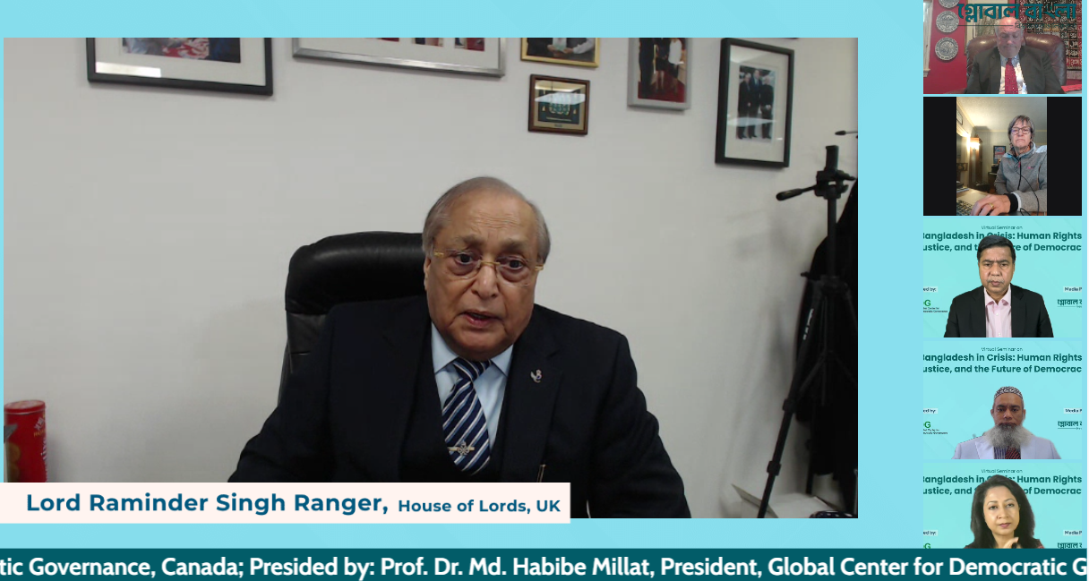 “Bangladesh in Crisis: Human Rights, Justice, and the Future of Democracy” শীর্ষক আয়োজিত এ ভার্চুয়াল সেমিনারে জিসিডিজি’র সভাপতি অধ্যাপক ডা. মো. হাবিবে মিল্লাত এর সভাপতিত্বে বক্তব্য রাখেন ইংল্যান্ডের হাউজ অব লর্ডস এর সদস্য লর্ড রামিন্দ্র সিং রেঞ্জার, আমেরিকান এন্টারপ্রাইজ ইনস্টিটিউট এর সিনিয়র ফেলো মাইকেল রুবিন এবং সুইজারল্যান্ডের পাবলিক রেডিওর এডিটর শার্লট জ্যাকুইমার্ট।