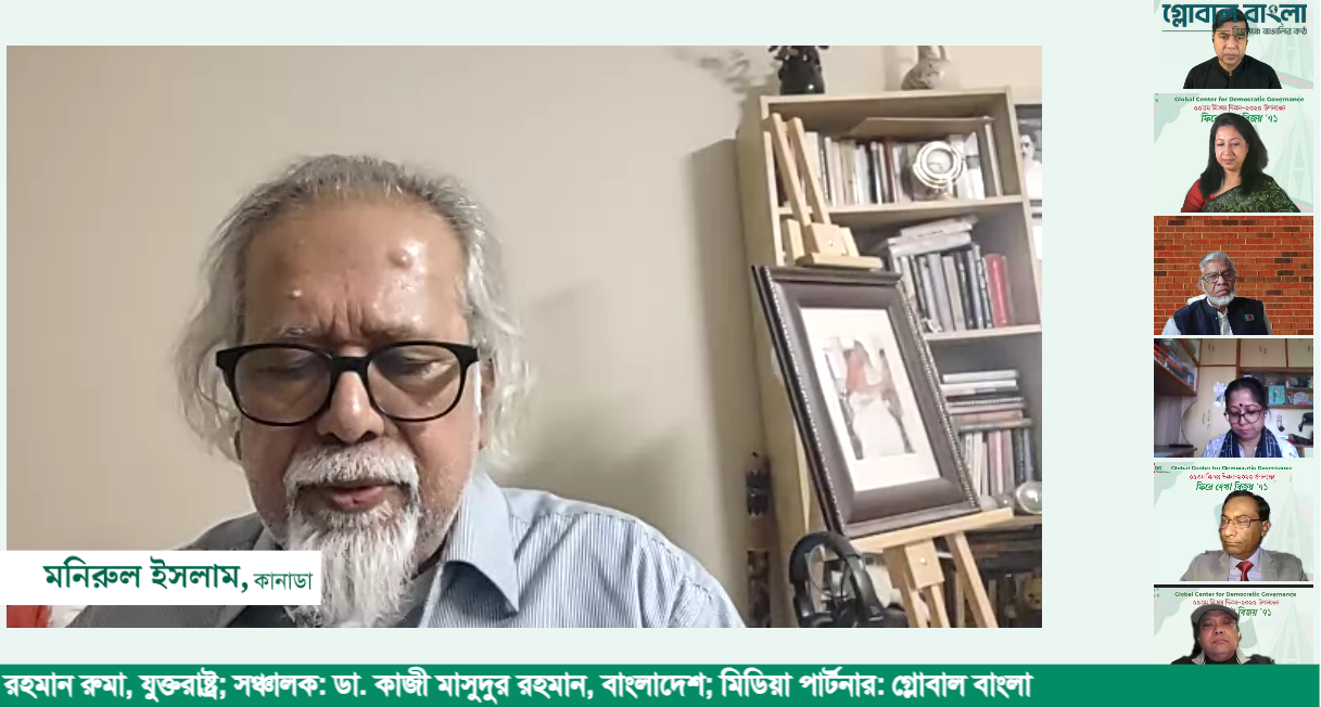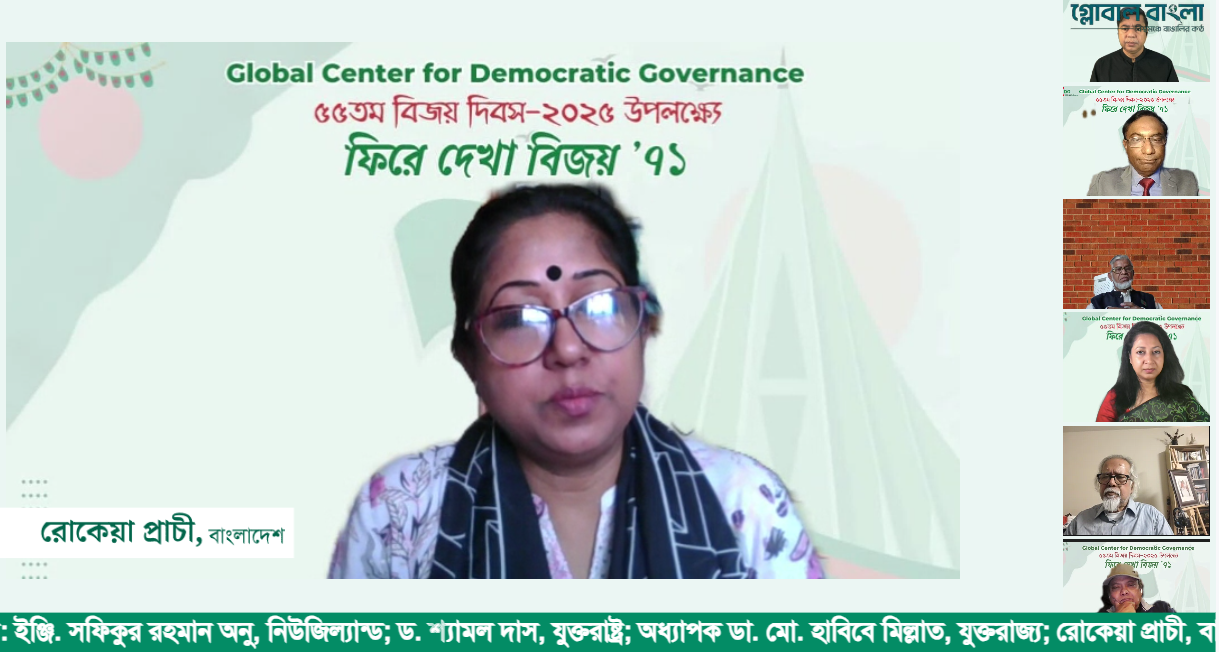 মহান বিজয় দিবস উপলক্ষে গ্লোবাল সেন্টার ফর ডেমোক্রেটিক গভর্ন্যান্সের উদ্যোগে ‘ফিরে দেখা বিজয় ’৭১’ শীর্ষক একটি অনলাইন আলোচনা অনুষ্ঠিত হয়েছে। ১৪ ডিসেম্বর রবিবার বাংলাদেশ সময় সকাল ৯টায় অনুষ্ঠানটি সরাসরি সম্প্রচার করা হয়।