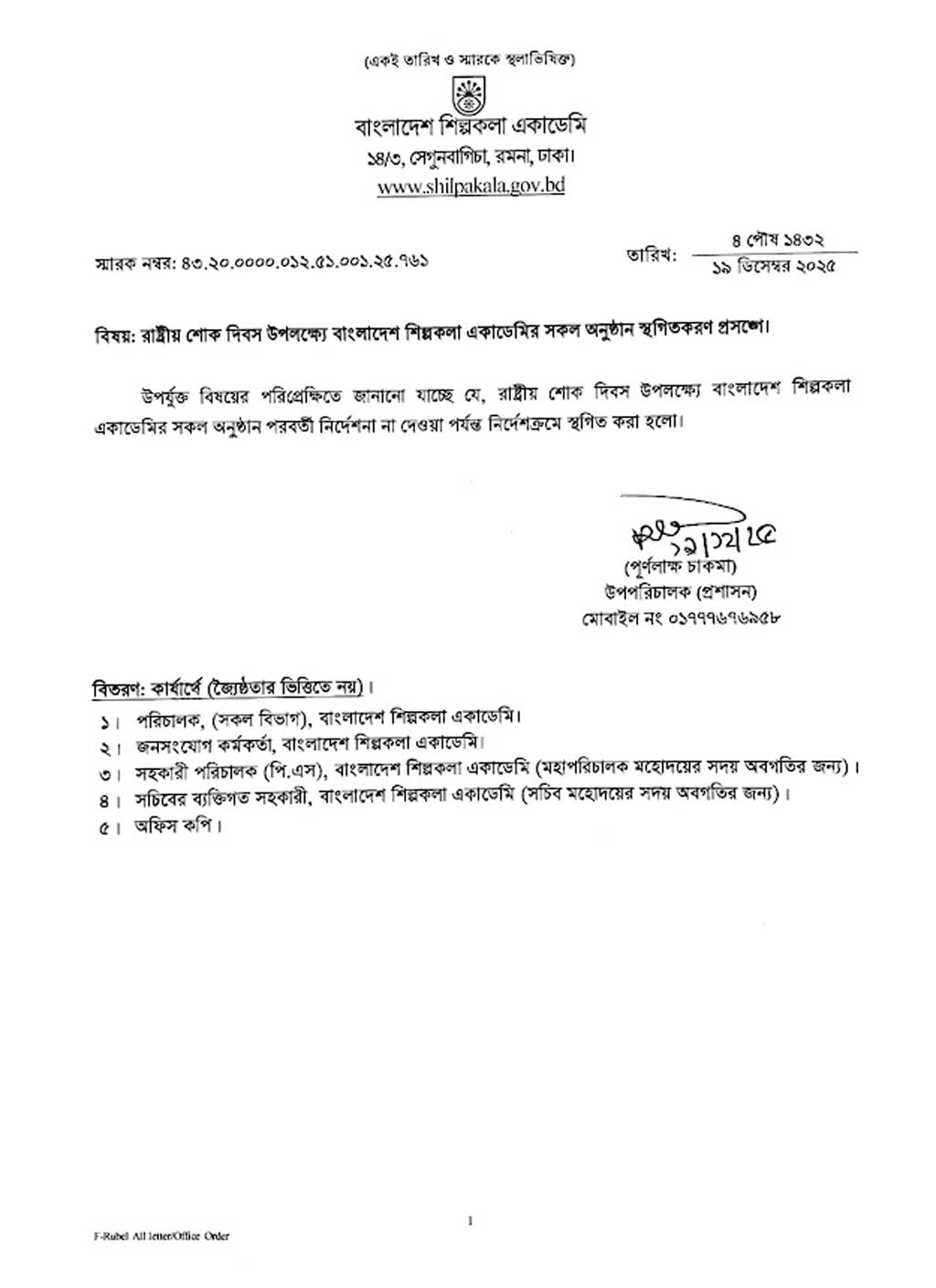 পরবর্তী নির্দেশনা না দেওয়া পর্যন্ত সব অনুষ্ঠান ও প্রদর্শনী স্থগিত করেছে বাংলাদেশ শিল্পকলা একাডেমি।