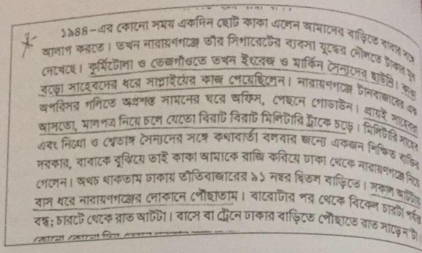 প্রায়ই সাহেবরা আসতো, মালপুর নিয়ে চলে যেতো বিরাট বিরাট মিলিটারি ট্রাকে চড়ে। মিলিটারি সাহেব এবং নিগ্রো ও শ্বেতাঙ্গ সৈন্যদের সঙ্গে কথাবার্তা বলবার জন্যে একজন শিক্ষিত ব্যক্তির দরকার, বাবাকে বুঝিয়ে তাই কাকা আমাকে রাজি করিয়ে ঢাকা থেকে নারায়ণগঞ্জে নিয়ে গেলেন। অথচ থাকতাম ঢাকায় তাঁতিবাজারের ৯১ নম্বর দ্বিতল বাড়িতে। সকাল আটটায় বাস ধরে নারায়ণগঞ্জের দোকানে পৌঁছাতাম। বারোটার পর থেকে বিকেল চারটা পর্যন্ত বন্ধ; চারটে থেকে রাত আটটা। বাসে বা ট্রেনে ঢাকার বাড়িতে পৌঁছাতে রাত সাড়ে ন’টা।”)