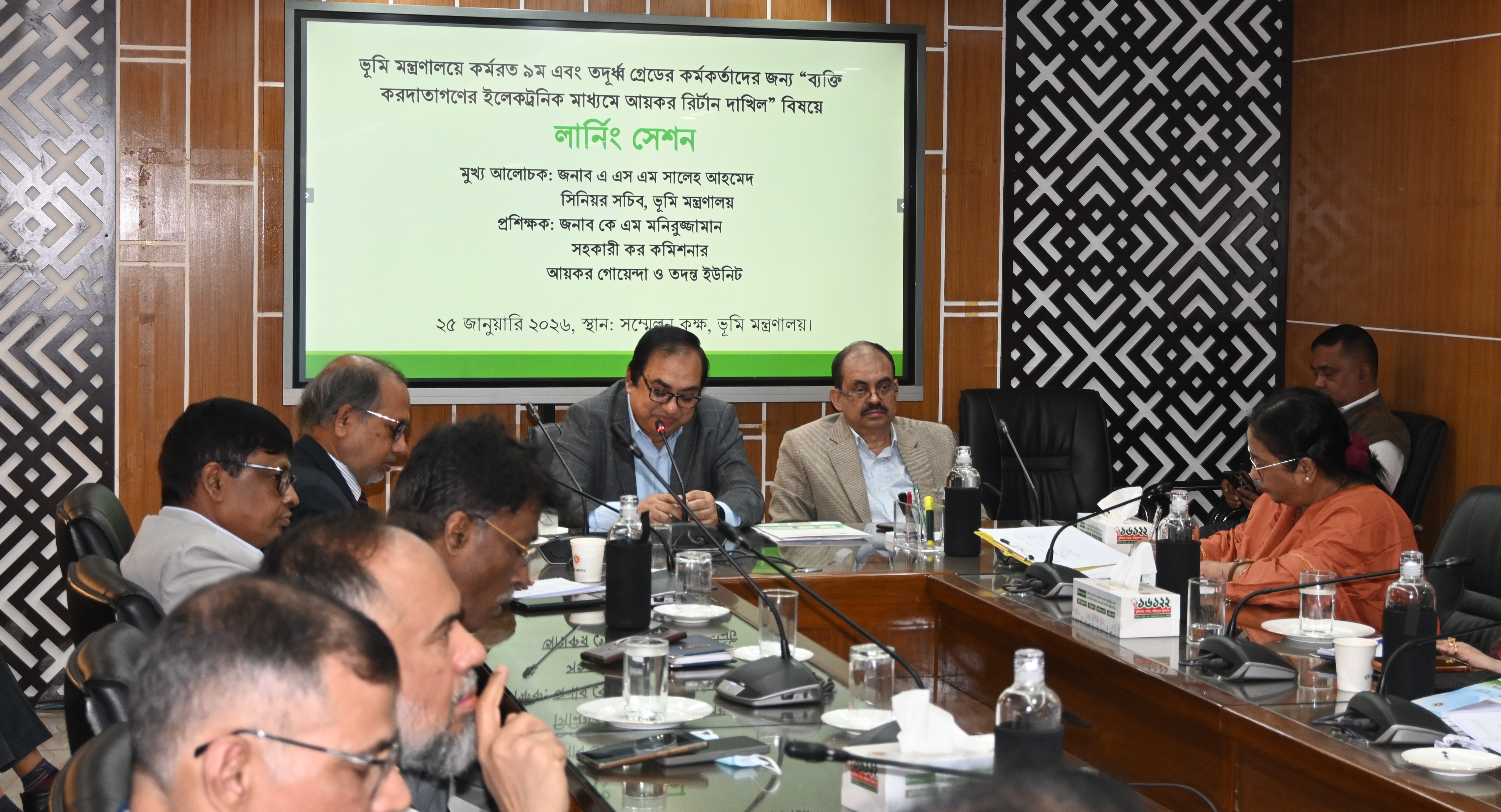 রবিবার ভূমি মন্ত্রণালয়ের সভাকক্ষে আয়োজিত ‘ভূমি মন্ত্রণালয়ের কর্মরত নবম ও তদূর্ধ্ব গ্রেডের কর্মচারীদের জন্য ব্যক্তি করদাতাগণের ইলেকট্রনিক মাধ্যমে আয়কর রিটার্ন দাখিল’ বিষয়ক লার্নিং সেশনে প্রধান আলোচকের বক্তব্যে তিনি এসব কথা বলেন। লার্নিং সেশনে প্রশিক্ষক হিসেবে উপস্থিত ছিলেন জাতীয় রাজস্ব বোর্ডের কর গোয়েন্দা ও তদন্ত ইউনিটের সহকারী কমিশনার এ কে এম মনিরুজ্জামান।