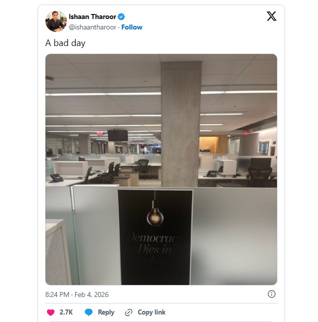 দীর্ঘদিনের ঐতিহ্যবাহী মার্কিন সংবাদপত্র ওয়াশিংটন পোস্টে বড় ধরনের কর্মী ছাঁটাইয়ের ঘটনায় বিশ্বজুড়ে আলোড়ন তৈরি হয়েছে। প্রায় আটশ সাংবাদিকের মধ্যে তিন শতাধিককে একসঙ্গে চাকরি থেকে অব্যাহতি দেওয়া হয়েছে। এই তালিকায় রয়েছেন ভারতের কংগ্রেস নেতা শশী থারুরের ছেলে ও আন্তর্জাতিক বিষয়ক জ্যেষ্ঠ কলামিস্ট ঈশান থারুরও। শুধু কর্মী ছাঁটাই নয়, বন্ধ করে দেওয়া হয়েছে ক্রীড়া বিভাগ, কয়েকটি বিদেশি ব্যুরো এবং বই–সংক্রান্ত কভারেজ, যা পত্রিকাটির দীর্ঘ ইতিহাসে বড় ধাক্কা হিসেবে দেখা হচ্ছে।