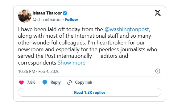 চাকরি হারানোর খবর সামাজিক মাধ্যমে নিজেই জানিয়েছেন ঈশান থারুর। তিনি জানিয়েছেন, আন্তর্জাতিক বিভাগের অধিকাংশ সহকর্মীর সঙ্গে তাকেও বিদায় নিতে হয়েছে এবং এতে তিনি ভেঙে পড়েছেন। প্রায় বারো বছর ধরে সহকর্মীদের সঙ্গে কাজ করার অভিজ্ঞতাকে তিনি সম্মানের বলে উল্লেখ করেন। পাশাপাশি বিশ্ব পরিস্থিতি ও যুক্তরাষ্ট্রের ভূমিকা পাঠকদের সামনে তুলে ধরার লক্ষ্য নিয়ে শুরু করা তার কলাম বিপুল পাঠকসমর্থন পেয়েছিল বলেও জানান তিনি।
