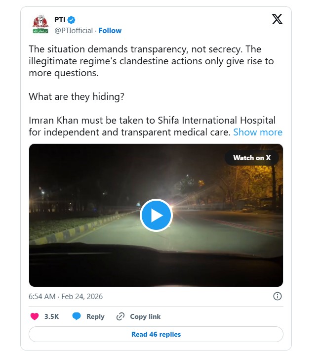 পিটিআই নেতা ও অন্যান্য প্রতিরোধ দলের প্রতিনিধিরা বলেন, রাতের এই চিকিৎসা ঘটা ঘটনা আইনগত ও মানবিক অধিকার লঙ্ঘন করে। তারা বলেন, একজন সাবেক প্রধানমন্ত্রীকে পরিবার ও ব্যক্তিগত চিকিৎসক ছাড়াই চিকিৎসা করানো উচিত নয়। শীর্ষ আদালতের রেজিস্ট্রারকে আবেদন করে তারা দ্রুত ইমরানের মুকাদ্দমা শুনানির অনুরোধ করেন। দলের পক্ষ থেকে তারা সঠিক চিকিৎসা ও স্বচ্ছতা চাইছেন যাতে জনগণের বিশ্বাস ফিরিয়ে আনা যায়।