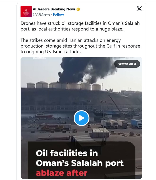 শুধু জাহাজ চলাচলই নয়, উপসাগরীয় অঞ্চলের স্থল অবকাঠামোও হামলার মুখে পড়েছে। দুবাইয়ের একটি বিলাসবহুল হোটেলে ড্রোন হামলার খবর পাওয়া গেছে। ওমানের সালালাহ বন্দরের তেল স্থাপনাতেও আগুন লাগে। বাহরাইন জানিয়েছে, মুহাররাক গভর্নরেট এবং আন্তর্জাতিক বিমানবন্দরের কাছে জ্বালানি অবকাঠামো লক্ষ্য করে ড্রোন কার্যক্রম দেখা গেছে।