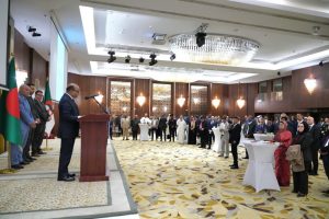 সন্ধ্যায় আলজিয়ার্সের ম্যারিয়ট হোটেলে একটি বর্ণাঢ্য সংবর্ধনা অনুষ্ঠানের আয়োজন করা হয়। অনুষ্ঠানে প্রধান অতিথি হিসেবে উপস্থিত ছিলেন আলজেরিয়ার জ্ঞান অর্থনীতি, স্টার্টআপ ও ক্ষুদ্র শিল্প বিষয়ক মন্ত্রী নূরেদ্দিন ওয়েদাহ। এছাড়াও স্বাগতিক দেশের রাজনৈতিক ব্যক্তিত্ব, উচ্চপদস্থ সরকারি কর্মকর্তা, বিভিন্ন দেশের রাষ্ট্রদূত ও কূটনীতিক, শিক্ষাবিদ, ব্যবসায়ী, সুশীল সমাজের প্রতিনিধি, যুবনেতা, স্বেচ্ছাসেবী সংগঠনের নেতৃবৃন্দ, বিশিষ্ট সাংবাদিক এবং প্রবাসী বাংলাদেশিরা এতে অংশ নেন। অনুষ্ঠানে কেক কাটা হয় এবং অতিথিদের জন্য নৈশভোজের আয়োজন করা হয়।
