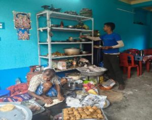 নীল জামা পরিহিত মনোজ সাহা দোকানের কাজে ব্যস্ত