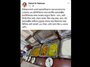 গতকাল ড।: জাহেদ ফেসবুকে পোস্ট দিয়েছেন প্রধানমন্ত্রী তারেক রহমান সংবাদপত্র মালিকদের সংগঠন নোয়াবের সদস্যদের সঙ্গে দুপুরে কি খাবার খেয়েছেন সেটা নিয়ে। খাবারের ছবি সহ তালিকায় দেখলাম একেবারেই সাদামাটা মেনু। জাহেদ সাহেব আরো উল্লেখ করেছেন বিকেলের নাস্তা এবং দুপুরের খাওয়া সহ একজনের মোট খরচ ১৫০ টাকা। অর্থাৎ এটাই প্রধানমন্ত্রীর দুপুর এবং বিকেলের খাওয়ার খরচ। তিনি আরো উল্লেখ করেছেন এটা আগের সরকার প্রধানদের তুলনায় পাঁচ থেকে ছয় ভাগ কম। তার এই পোস্ট দেখে আমার এক ফেসবুক বন্ধু আমাকে ইনবক্সে একটা মন্তব্য পাঠিয়েছেন। সেটা শেয়ার করছি।