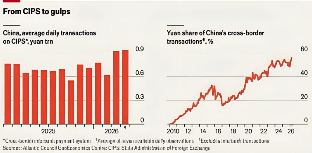 সাম্প্রতিক সময়ে চীনের বিকল্প আন্তঃদেশীয় পেমেন্ট ব্যবস্থা সিআইপিএস-এর লেনদেন উল্লেখযোগ্যভাবে বেড়েছে। মার্চ মাসে প্রতিদিন গড়ে প্রায় ৯২০ বিলিয়ন ইউয়ান লেনদেন হয়েছে, যা আগের বছরের তুলনায় অনেক বেশি । এমনকি কিছু দিনে এই পরিমাণ ১.২ ট্রিলিয়ন ইউয়ান ছাড়িয়েছে। এই উল্লম্ফনের পেছনে মধ্যপ্রাচ্যের উত্তেজনা ও তেল বাণিজ্যের প্রভাব গুরুত্বপূর্ণ ভূমিকা রেখেছে বলে ধারণা করা হচ্ছে।