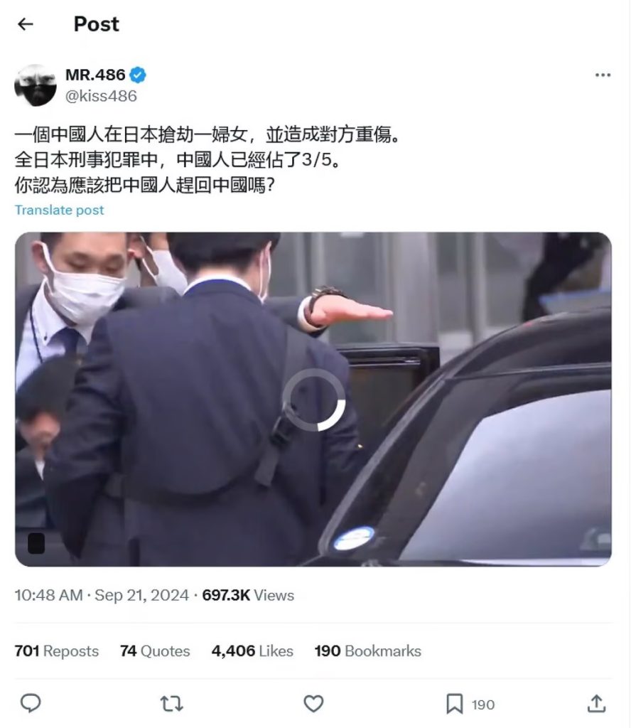 সেপ্টেম্বর ২১ তারিখে শেয়ার করা হয়েছিল – মাত্র কয়েকদিন পরে যখন একটি ১০ বছরের জাপানি ছেলে শেনজেনে চীনে ছুরিকাঘাতে নিহত হয়েছিল – পোস্টটিতে দাবি করা হয়েছিল যে জাপানে সকল অপরাধের ৬০ শতাংশই চীনা নাগরিকদের দ্বারা সংঘটিত হয়।“একজন চীনা পুরুষ জাপানে একটি মহিলাকে লুট করে এবং তাকে গুরুতরভাবে আঘাত করেছে,” ইউজার এমআর। ৪৮৬-এর পোস্টে বলা হয়েছে। “চীনারা ইতিমধ্যে জাপানে প্রতি পাঁচটি অপরাধের তিনটি অপরাধে জড়িত। আপনি কি মনে করেন চীনারা চীনে ফিরে যাওয়া উচিত?” চীনা ভাষায় এই বার্তাটি দ্রুত ৬৯৭,০০০-এরও বেশি দর্শক পেয়েছিল, ৪,৪০৬টি “পছন্দ” এবং ৭০১ বার পুনরায় পোস্ট করা হয়েছিল।