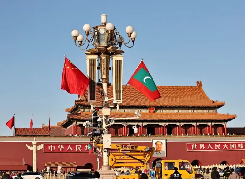 জানুয়ারিতে প্রেসিডেন্ট মুইজ-এর চীন সফরের সময় তিয়েন আন মেন স্কোয়ারে দুই দেশের পতাকা
