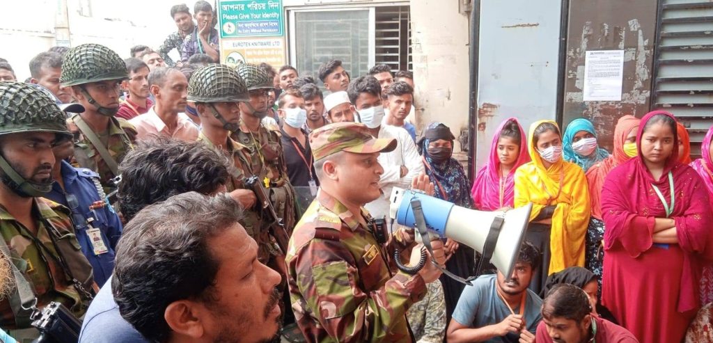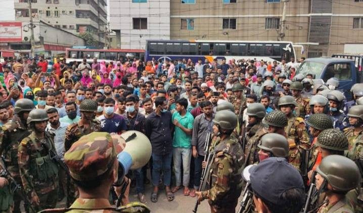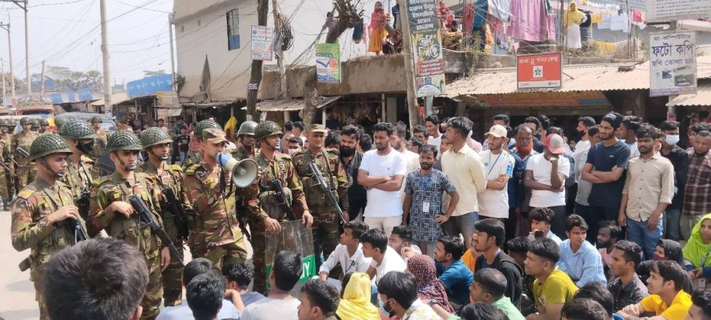 ৬ স্বতন্ত্র এডি ব্রিগেড এর অধীনস্থ একটি ইউনিট কর্তৃক মোতায়েন এলাকায় যমুনা ফ্যাশন পোশাক শিল্প কারখানায় গার্মেন্টস শ্রমিকদের সমস্যা নিরসনে বাংলাদেশ সেনাবাহিনীর অবস্থান