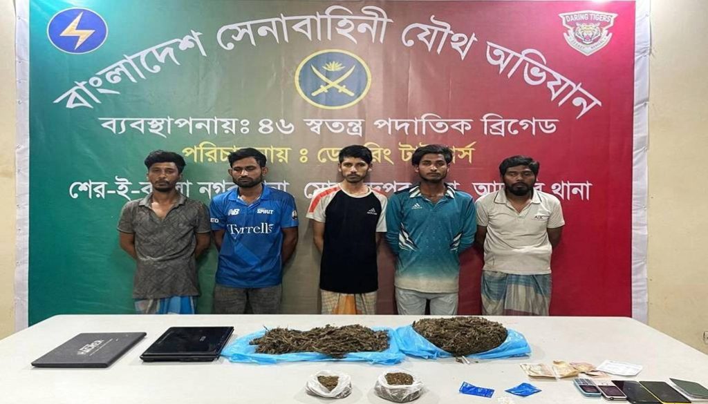 যৌথ অভিযানে ৪৬ স্বতন্ত্র পদাতিক ব্রিগেড কর্তৃক (বসিলা আর্মি ক্যাম্প) অপারেশন চালিয়ে ল্যাপটপ, মোবাইল, নগদ টাকা ও মাদক সহ মাদক ব্যবসায়ী গ্রেফতারের একটি দৃশ্য