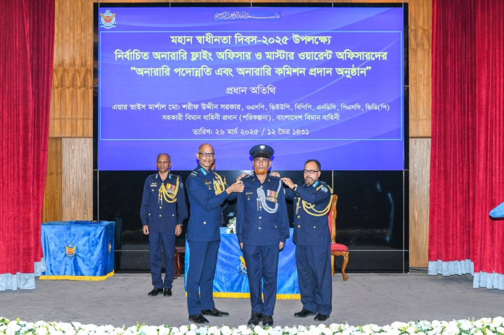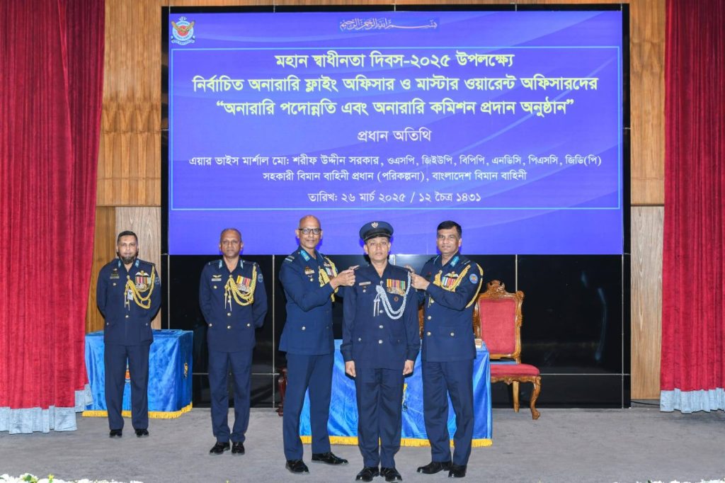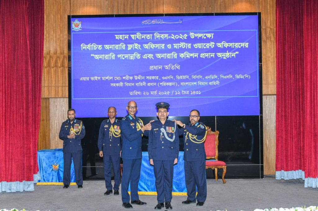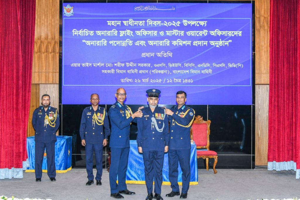 মহান স্বাধীনতা দিবস-২০২৫ উপলক্ষ্যে বিমান বাহিনীর নির্বাচিত অনারারি ফ্লাইং অফিসার ও মাস্টার ওয়ারেন্ট অফিসারদের ‘‘অনারারি পদোন্নতি এবং অনারারি কমিশন প্রদান’’ অনুষ্ঠান ২৬ মার্চ ২০২৫, বুধবার বাংলাদেশ বিমান বাহিনী সদর দপ্তরে অনুষ্ঠিত হয়।