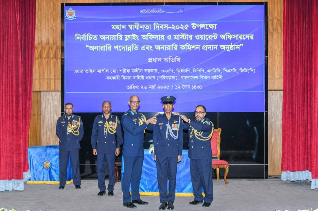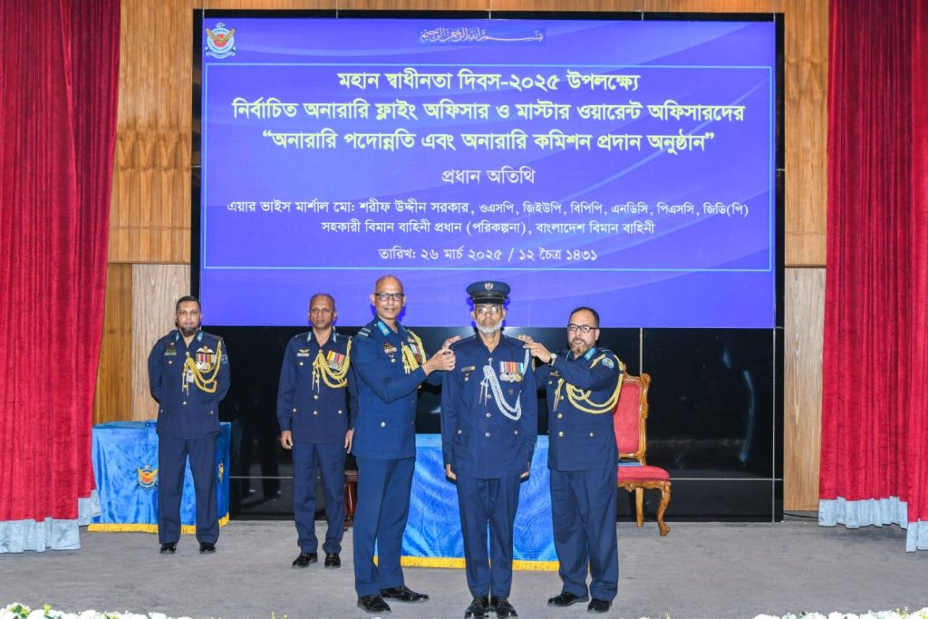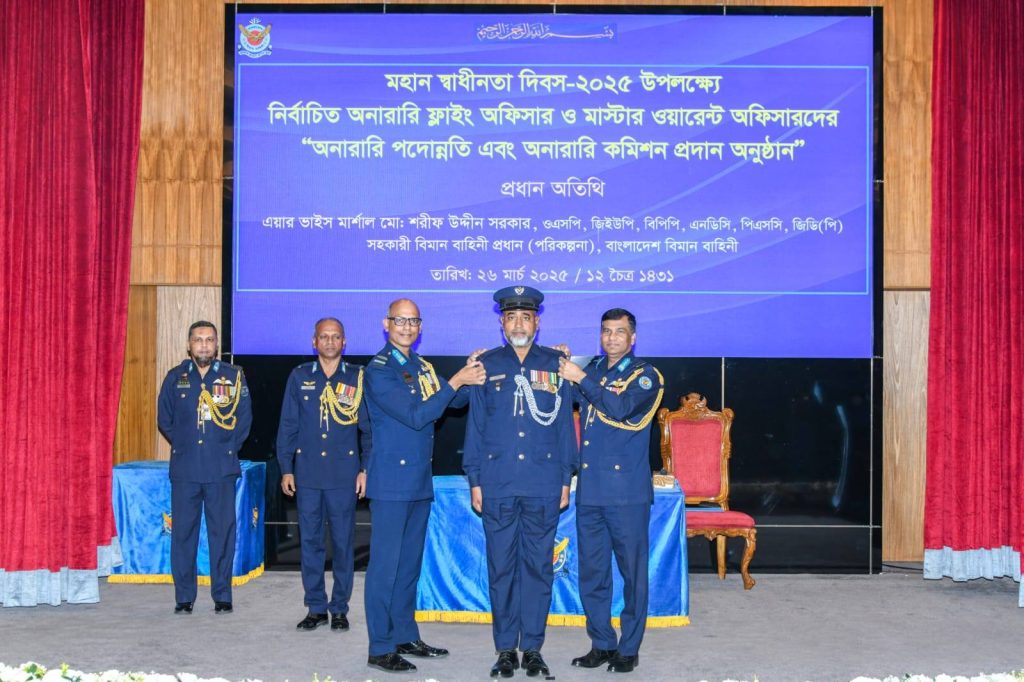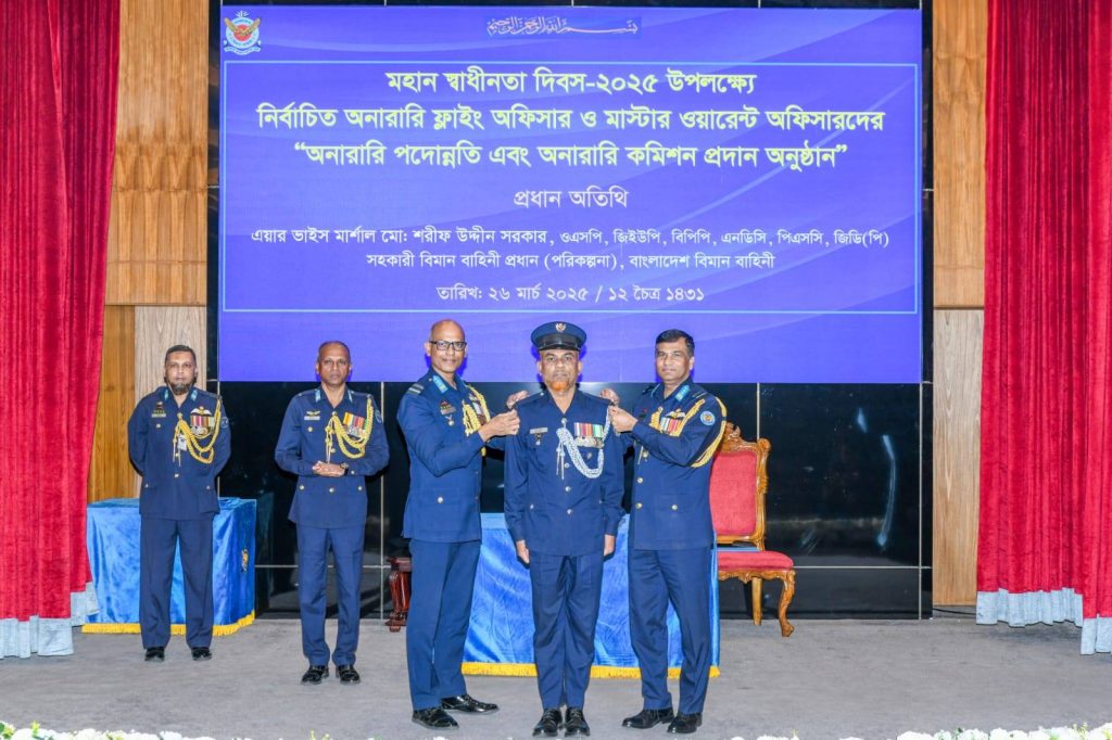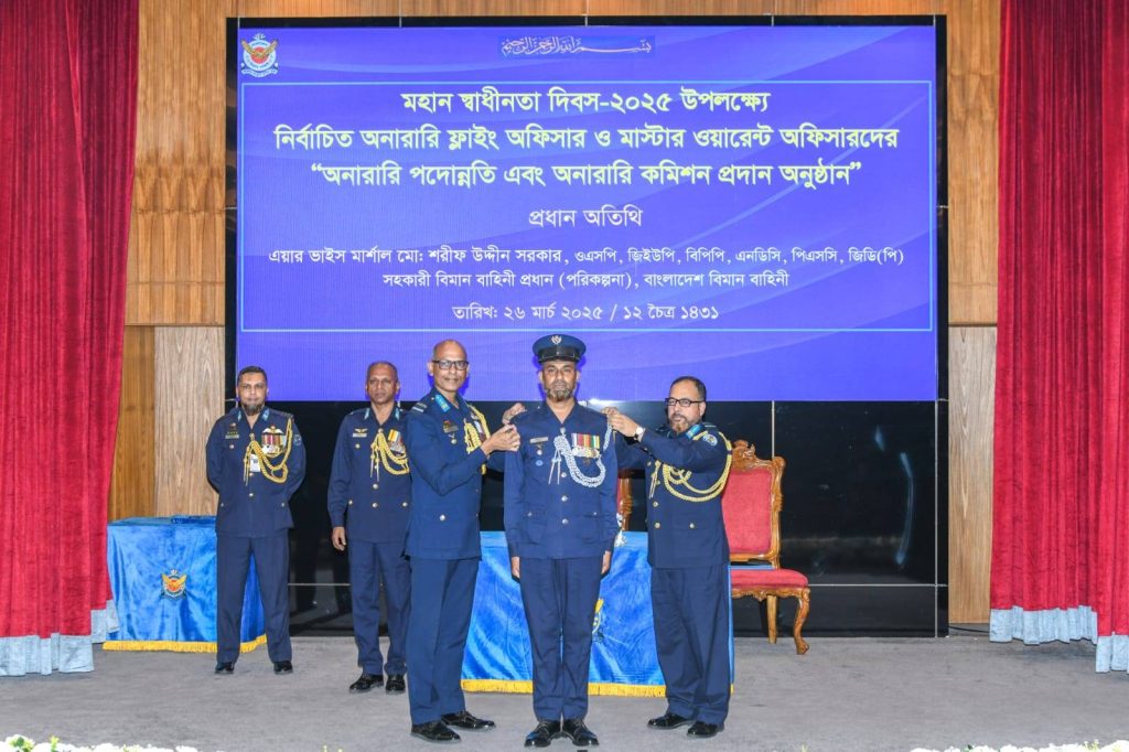 মহান স্বাধীনতা দিবস-২০২৫ উপলক্ষ্যে বিমান বাহিনীর নির্বাচিত অনারারি ফ্লাইং অফিসার ও মাস্টার ওয়ারেন্ট অফিসারদের ‘‘অনারারি পদোন্নতি এবং অনারারি কমিশন প্রদান’’ অনুষ্ঠান ২৬ মার্চ ২০২৫, বুধবার বাংলাদেশ বিমান বাহিনী সদর দপ্তরে অনুষ্ঠিত হয়।