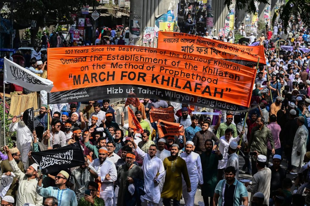 ছবি: পুরুষ প্রতিবাদকারীরা এক রাস্তায় হেঁটে যাচ্ছে; কারো কারো হাতে বড় কমলা ব্যানার, যার একটি ব্যানারে লেখা “খিলাফতের জন্য মার্চ”।
