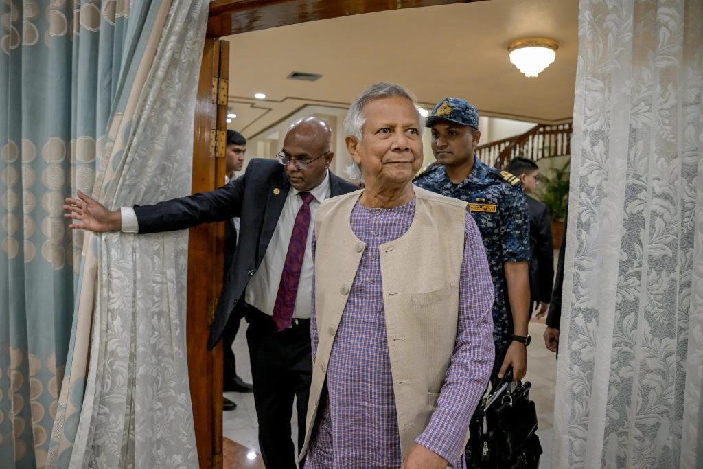 ছবি: বেগুনি ও খাকি পোশাকে সজ্জিত ধূসর চুলের মুহাম্মদ ইউনুস, যিনি একটি রুমে প্রবেশ করছেন; পাশে একজন সুরক্ষা কর্মী ও একজন ব্যবসায়িক পোশাক পরিহিত ব্যক্তি রয়েছেন।