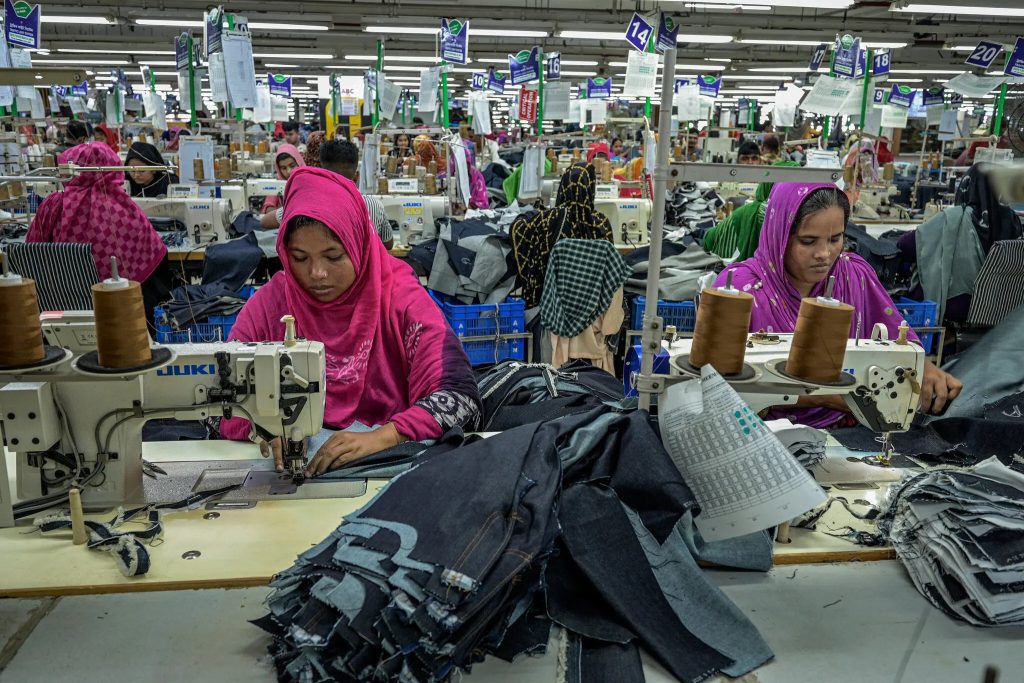 ছবি: ঢাকার উপশহরে একটি গার্মেন্ট ফ্যাক্টরিতে কর্মীরা একসাথে জিনস সেলাই করছেন।