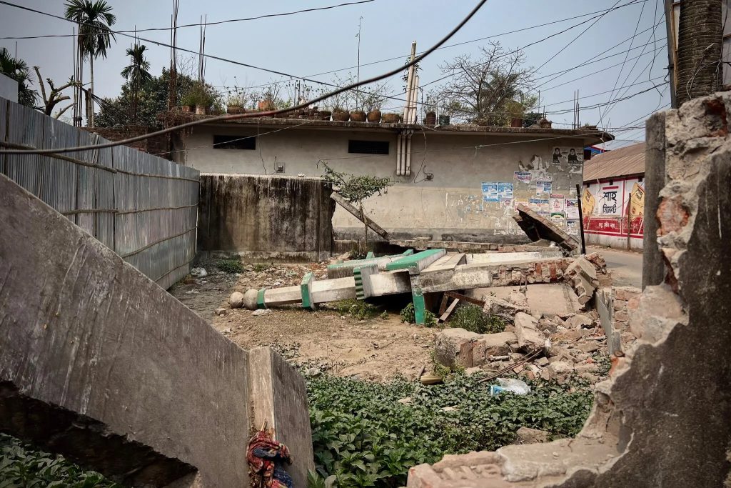 ছবি: ভাঙ্গা কংক্রিটের বেড়ার মধ্য দিয়ে নির্মাণের ধ্বংসাবশেষের একটি স্তূপ দেখা যাচ্ছে।