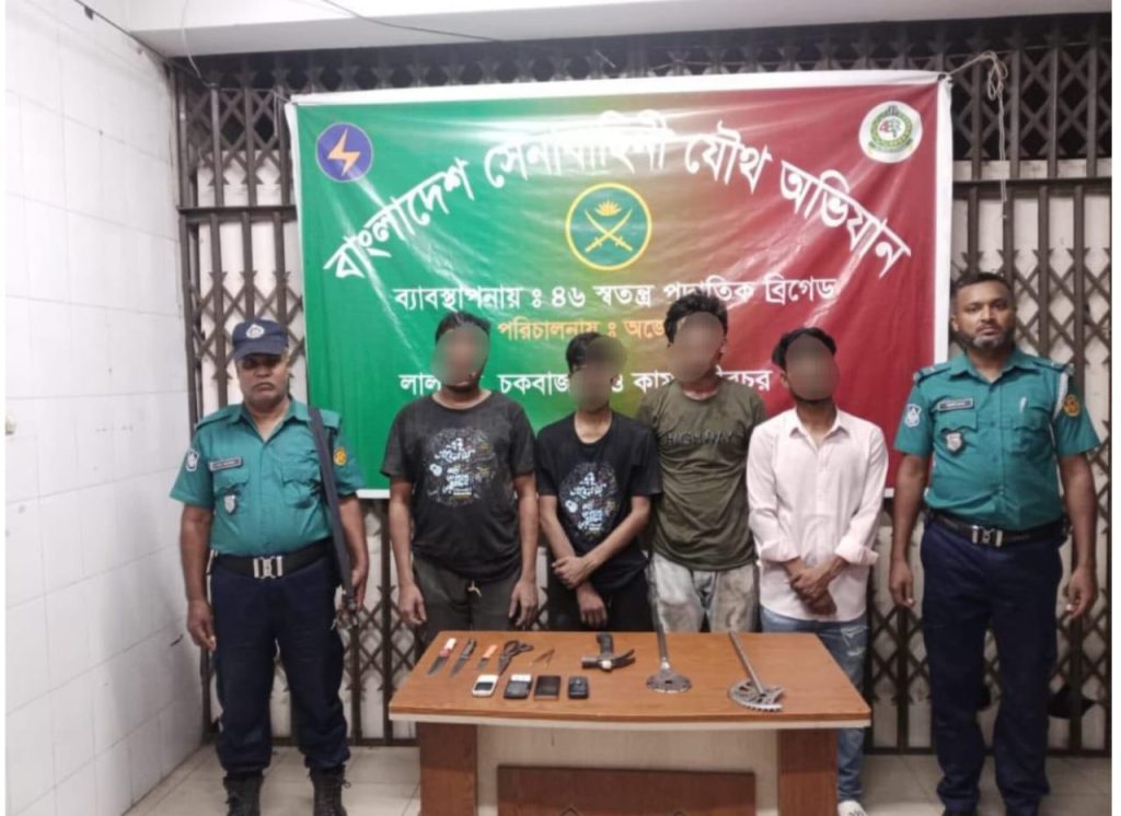 চট্টগ্রাম এরিয়ায় যৌথ অভিযান পরিচালনা করে মাদকদ্রব্য, দেশী/বিদেশী ধারালো অস্ত্র, নগদঅর্থ ও মোবাইল ফোনসহ ০৪ জন মাদক ব্যবসায়ী ও সন্ত্রাসী গ্রেফতার