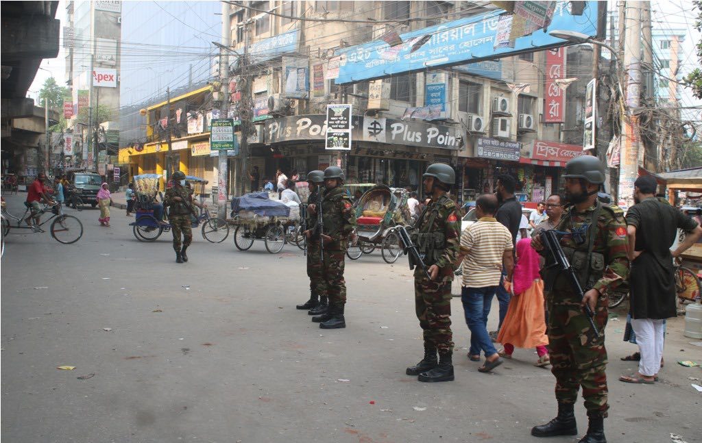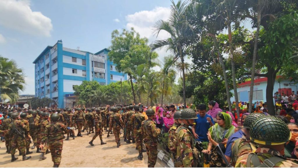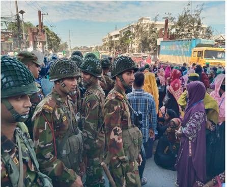 ২৪ পদাতিক ডিভিশন এর অধীনস্থ একটি ইউনিট কর্তৃক বেসামরিক প্রশাসনের সহায়তায় মোতায়েনকৃত এলাকার গার্মেন্টস কর্মীদের আন্দোলন নিয়ন্ত্রণের দৃশ্য