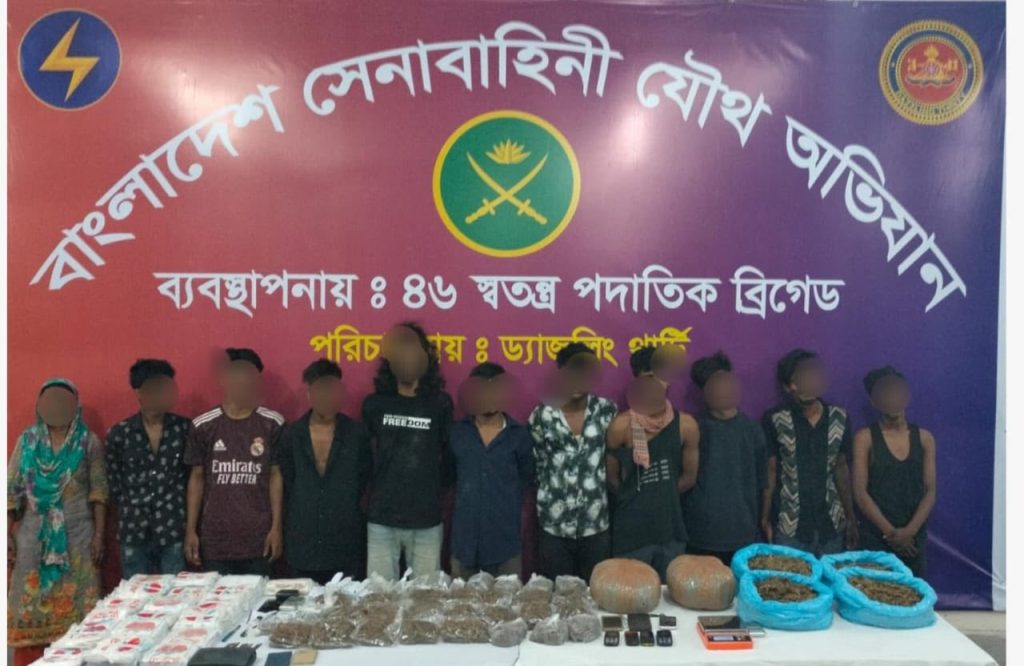 ৪৬ স্বতন্ত্র পদাতিক ব্রিগেড এর অধীনস্থ ইউনিট কর্তৃক নীল ক্ষেত এলাকা হতে ২০ কেজি গাজা, ০৮টি মোবাইল ফোন এবং ০৭টি সুইস ব্লেডসহ মাদক চক্রের ১২ জনকে গ্রেফতার করা হয়