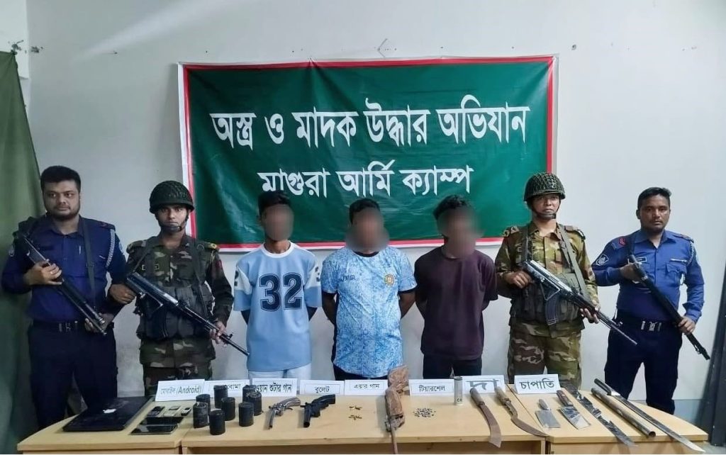 যশোর অঞ্চলের মাগুরা আর্মি ক্যাম্প হতে যৌথ অভিযান পরিচালনা করে তিনটি আগ্নেয়াস্ত্র, বোমা এবং দেশীয় অস্ত্রসহ তিনজন সন্ত্রাসীকে গ্রেফতার করা হয়